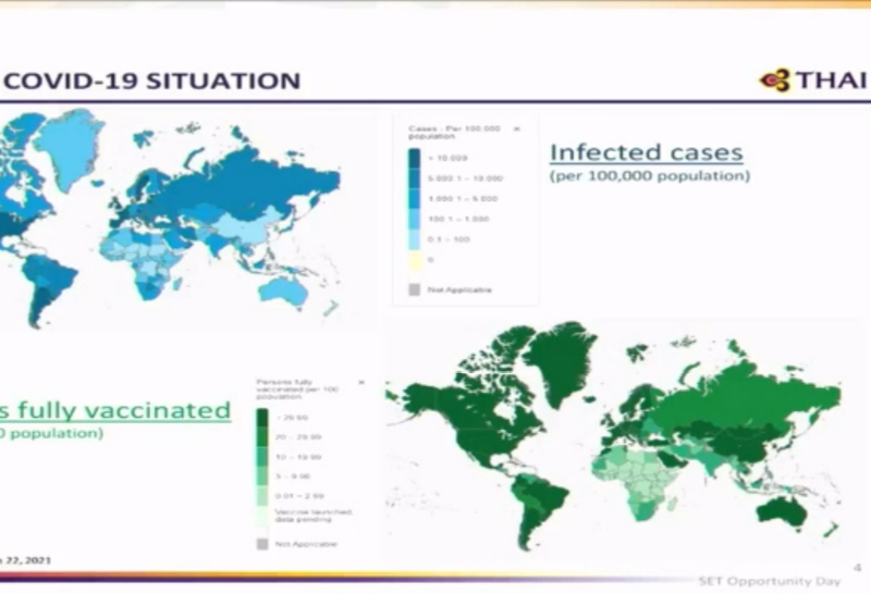 นาย ชาย เอี่ยมศิริ ประธานเจ้าหน้าที่สายการเงินและการบัญชี บริษัท การบินไทย จำกัด (มหาชน) กล่าวในโอกาส พบผู้ลงทุน ว่า ปัจจุบันธุรกิจสายการบินทั่วโลกกว่า 80- 90% ยังได้รับผลกระทบจากการแพร่ระบาดของ โควิด-19 และ สถานการณ์ของสายการบินจะกลับมาฟื้นตัวได้ก็ขึ้นอยู่กับการป้องกันแพร่ระบาดของ โควิด-19 การกระจายวัคซีนให้กับประชากรในแต่ละประเทศ ตัวอย่างเช่นประเทศยุโรป จีน ญี่ปุ่น ที่มีการติดเชื้อสูง แต่การกระจายวัคซีนก็ทำได้สูงด้วยเช่นกันต่อประชากร กลุ่มประเทศเหล่านี้ เป็นกลุ่มที่มีความเกี่ยวเนื่องกับธุรกิจของการบินไทย ถือได้ว่าเป็นตลาดหลัก ซึ่งต้องติดตามว่า กลุ่มประเทศเหล่านี้จะมีความพร้อมเปิดประเทศเมื่อใด ซึ่งจะทำให้ธุรกิจของการบินไทยจะกลับมาฟื้นตัวได้