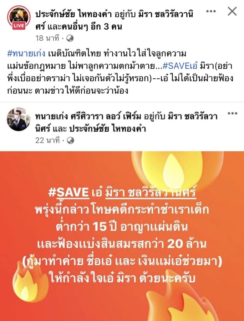 โดย นายห้างไหทองคำ “ประจักษ์ชัย ไหทองคำ” ได้แชร์โพสต์ของ “ทนายเก่ง” ที่รับหน้าที่ดูแลคดีให้ “เอ๋ มิรา” ที่โพสต์แจ้งเอาไว้ว่า “#SAVE เอ๋ มิรา ชลวิรัลวานิศร์ พรุ่งนี้กล่าวโทษคดีกระทำชำเราเด็ก ต่ำกว่า 15 ปี อาญาเเผ่นดิน เเละฟ้องเเบ่งสินสมรสกว่า 20 ล้าน (กู้มาทำค่าย ชื่อเอ๋ เเละ เงินเเม่เอ๋ช่วยมา) ให้กำลังใจเอ๋ มิรา ด้วยนะครับ”