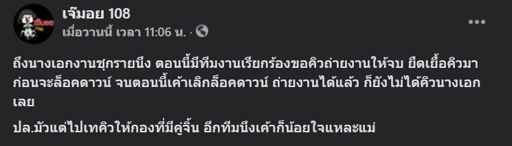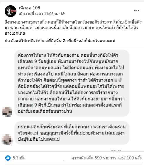 “ถึงนางเอกงานชุกรายนึง ตอนนี้มีทีมงานเรียกร้องขอคิวถ่ายงานให้จบ ยืดเยื้อคิวมาก่อนจะล็อกดาวน์ จนตอนนี้เค้าเลิกล็อกดาวน์ ถ่ายงานได้แล้ว ก็ยังไม่ได้คิวนางเอกเลย ป.ล.มัวแต่ไปเทคิวให้กองที่มีคู่จิ้น อีกทีมนึงเค้าก็น้อยใจแหละแม่”
