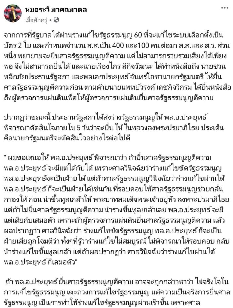 น.พ.ระวี มาศฉมาดล ส.ส.บัญชีรายชื่อ และหัวหน้าพรรคพลังธรรมใหม่ โพสต์เฟซบุ๊ก ส่วนตัว ระบุว่า จากการที่รัฐบาลได้ผ่านร่างแก้ไขรัฐธรรมนูญ 60 ที่จะแก้ไขระบบเลือกตั้งเป็นบัตร 2 ใบ และกำหนดจำนวน ส.ส.เป็น 400 และ 100 คน ต่อมา ส.ส.และ ส.ว. ส่วนหนึ่ง พยายามจะยื่นศาลรัฐธรรมนูญตีความ แต่ไม่สามารถรวบรวมเสียงได้เพียงพอ จึงไม่สามารถยื่นได้ และนายเรืองไกร ลีกิจวัฒนะ สมาชิกพรรคพลังประชารัฐได้ทำหนังสือถึง นายชวน หลีกภัยประธานรัฐสภา และพล.อ.ประยุทธ์ จันทร์โอชา นายกรัฐมนตรี ให้ยื่นศาลรัฐธรรมนูญตีความก่อน ตามด้วยนายแพทย์วรงค์ เดชกิจวิกรม รักษาการหัวหน้าพรรคไทยภักดี ได้ยื่นหนังสือถึงผู้ตรวจการแผ่นดินเพื่อให้ผู้ตรวจการแผ่นดินยื่นศาลรัฐธรรมนูญตีความต่อไป โดย นพ.ระวี กล่าวต่อว่า ปรากฏว่าขณะนี้ ประธานรัฐสภาได้ส่งร่างรัฐธรรมนูญให้ พล.อ.ประยุทธ์พิจารณาตัดสินใจภายใน 5 วันว่าจะยื่นให้ ในหลวงลงพระปรมาภิไธย ประเด็น คือ นายกรัฐมนตรีจะตัดสินใจอย่างไรต่อไปดี นพ.ระวี กล่าวว่า ตนขอเสนอให้ พล.อ.ประยุทธ์ พิจารณาว่า ถ้ายื่นศาลรัฐธรรมนูญตีความ พล.อ.ประยุทธ์ จะมีแต่ได้กับได้ เพราะศาลวินิจฉัยว่าร่างแก้ไขขัดรัฐธรรมนูญ พล.อ.ประยุทธ์จะเป็นฝ่ายได้ แต่ถ้าศาลรัฐธรรมนูญวินิจฉัยว่าร่างแก้ไขผ่านได้พล.อ.ประยุทธ์ ก็จะเป็นฝ่ายได้เช่นกัน ที่รอบคอบให้ศาลรัฐธรรมนูญช่วยกลั่นกรองให้ ก่อนนำขึ้นทูลเกล้าให้พระบาทสมเด็จพระเจ้าอยู่หัว ลงพระปรมาภิไธย แต่ถ้าไม่ยื่นศาลรัฐธรรมนูญตีความ นำร่างขึ้นทูลเกล้าเลย พล.อ.ประยุทธ์ จะมีแต่เสียกับเสมอตัว เพราะถ้าผู้ตรวจการแผ่นดินยื่นศาลรัฐธรรมนูญตีความ แล้วผลปรากฏว่า ศาลวินิจฉัยว่า ร่างแก้ไขขัดรัฐธรรมนูณ พล.อ.ประยุทธ์ ก็จะเป็นฝ่ายเสียถูกโจมตีว่า ทั้งๆที่รู้ว่าร่างแก้ไขไม่สมบูรณ์ ไม่พิจารณาให้รอบคอบ กลับนำร่างแก้ไขขึ้นทูลเกล้า แต่ถ้าผลปรากฏว่า ศาลวินิจฉัยว่าร่างแก้ไขผ่านได้ พล.อ.ประยุทธ์ ก็เสมอตัว