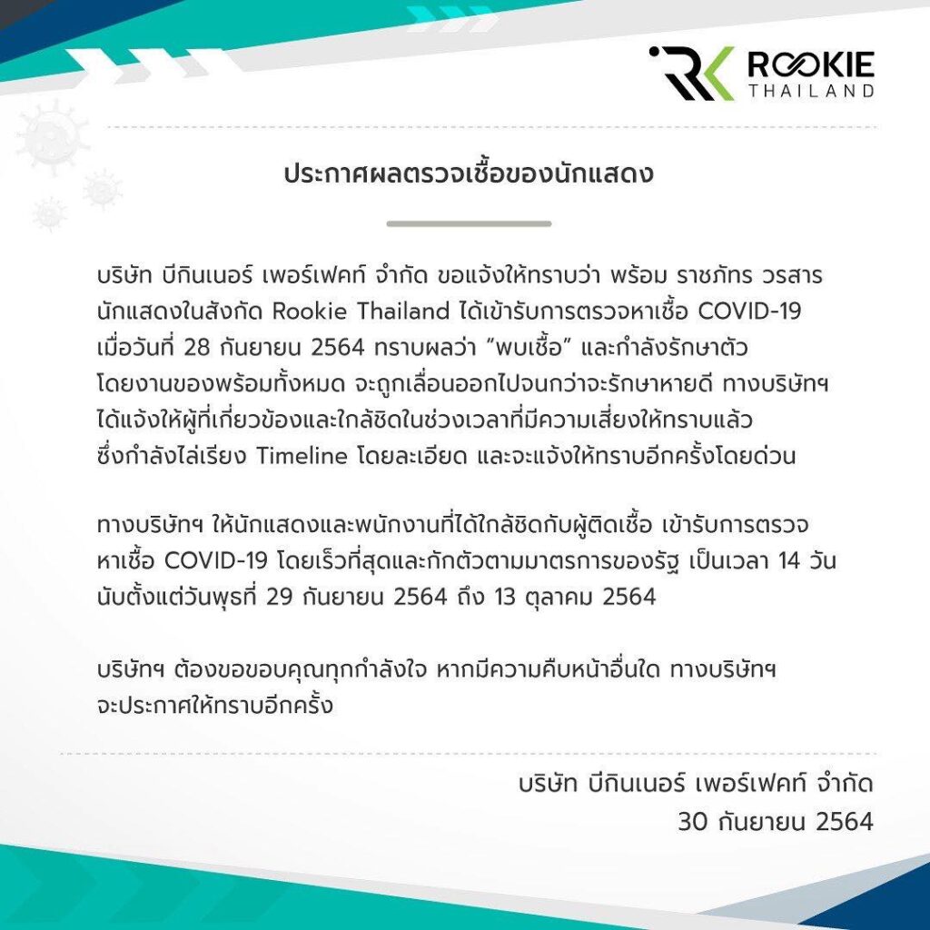 หลังจากก่อนหน้านี้ บริษัท บีกินเนอร์ เพอร์เฟคท์ จำกัด ต้นสังกัดของนักแสดงหนุ่มขวัญใจวัยรุ่น “พร้อม-ราชภัทร วรสาร” ได้ร่อนเอกสารแจ้งข่าวนักแสดงหนุ่มได้มีโอกาสสัมผัสใกล้ชิดกับผู้ป่วยติดเชื้อโควิด-19 ทำให้ต้องเข้าสู่กระบวนการกักตัวโดยด่วน และได้มีการตรวจหาเชื้อเรียบร้อยแล้ว ซึ่งต้องใช้ระยะเวลาในการรอผลตรวจประมาณ 2 วัน หากมีความคืบหน้าใด ๆ ทางบริษัทจะทำการประกาศให้ทราบโดยพร้อมกัน