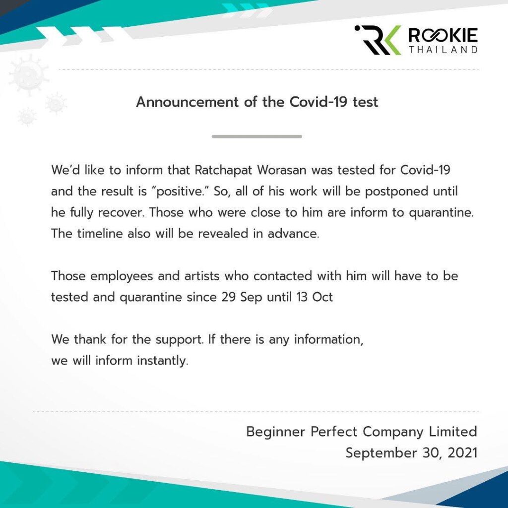 ล่าสุด ต้นสังกัดของ หนุ่มพร้อม ได้ออกมาแจ้งผลตรวจ หลังนักแสดงหนุ่มติดเชื้อโควิด-19 และกำลังอยู่ในช่วงรักษาตัว พร้อมกับประกาศเลื่อนตารางงานทั้งหมดออกไปก่อนจนกว่าจะรักษาหายเป็นปกติ โดยทางบริษัทได้แจ้งไปยังผู้ที่ใกล้ชิดนักแสดงหนุ่มในช่วงที่ผ่านมาให้ทราบแล้ว และกำลังอยู่ในช่วงไล่เรียง Timeline และจะแจ้งรายละเอียดให้ทราบอีกครั้ง อย่างไรก็ตามต้นสังกัดแจ้งว่า นักแสดงหรือทีมงานที่ใกล้ชิดให้กักตัวดูอาการเป็นเวลา 14 วัน