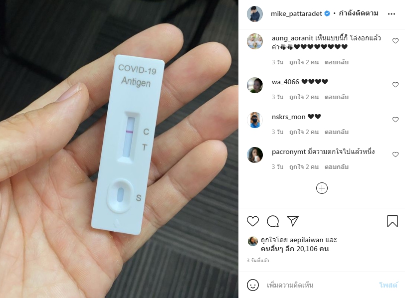 ทำเอาแฟนๆตกอกตกใจไปตามๆ กัน หลังพระเอกหนุ่ม “ไมค์ ภัทรเดช” ได้โพสต์ผลตรวจโควิด-19 ลงในอินสตาแกรมส่วนตัว พร้อมเขียนแคปชั่นไว้ว่า “เขาปลอดภัยนะ วันจันทร์ชั้นคิดถึงเธอ งั้นวันอังคารไปหาได้ไหม” แต่ที่ทำแฟนๆตกใจนั้นเพราะผลตรวจไม่ได้ขึ้นเพียงแค่ขีดเดียว แต่มีอีกขีด ที่ขึ้นมาแบบจางๆ