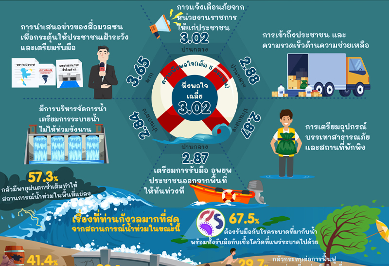 อย่างไรก็ตาม ประชาชน ยังให้คะแนนความพอใจต่อการเตรียมการรับมือสถานการณ์น้ำท่วม เฉลี่ย 3.02 คะแนนจากเต็ม 5 โดยด้านที่ได้คะแนนมากที่สุดคือ ด้านการนำเสนอข่าวของสื่อมวลชนเพื่อกระตุ้นให้ประชาชนเฝ้าระวัง และเตรียมรับมือ 3.65 คะแนน, ด้านการแจ้งเตือนภัย จากหน่วยงานราชการให้แก่ประชาชนได้ 3.02 คะแนน และด้านการเข้าถึงประชาชน และ ความรวดเร็วด้านความช่วยเหลือได้ 2.88 คะแนน