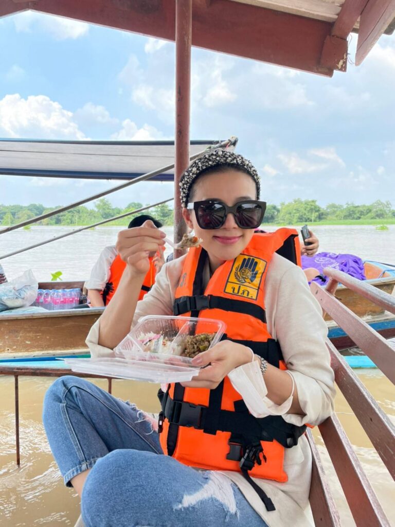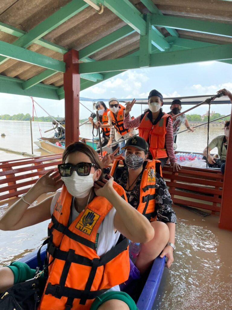 ซึ่งงานนี้ทั้งผู้จัดและเหล่านักแสดงก็ลงพื้นที่ลุยน้ำเอง ทั้งพายเรือ ลุยน้ำเข้าไปเคาประตูพี่น้องชาวปทุมธานีเพื่อมอบของให้ถึงมือมากที่สุด บ้างก็ช่วยหิ้วของส่งถึงบ้านก็มี แม้ระหว่างทางฝนจะตกลงมาอย่างหนักจนต้องรีบขึ้นฝั่งแต่เมื่อฝนหยุดก็ลงเรือลุยน้ำแจกต่อจนเสร็จภารกิจ โดยงานนี้ต้องขอขอบคุณผู้ใหญ่บ้านอนุวัตร ใจชอบ ต.เชียงรากน้อย อ.สามโคก จ.ปทุมธานี ที่มาลงพื้นที่ช่วยประสาน ช่วยลากเรือร่วมตากฝนแบบเต็มที่ไม่ถอยเหมือนกัน ทั้งนี้ผู้จัด กบ ปภัสรา ได้เผยความรู้สึกหลังเสร็จดังตั้งใจในครั้งนี้ว่า