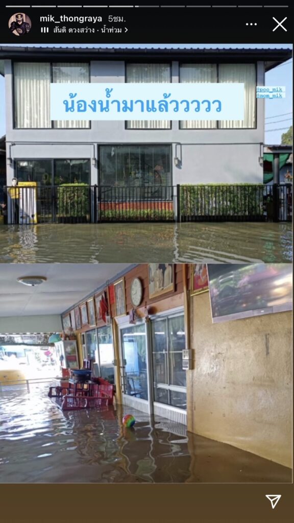 หลังจากที่พระเอกหนุ่ม “มิกค์ ทองระย้า ได้เผยภาพสุานการณ์น้ำท่วมที่จังหวัดสระบุรี ผ่านอินสตาแกรมส่วนตัว  ซึ่งระดับน้ำสูงเกือบถึงหลังคาบ้าน โดยมีคุณแม่อาศัยอยู่ ทำให้เจ้าตัวรู้สึกเป็นห่วงเป็นอย่างมาก