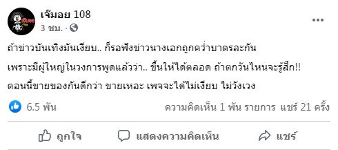 แต่ล่าสุดทางเพจดัง เจ๊มอย 108 ได้ออกมาเปิดประเด็นดังหลังข่าว ให้วงการบันเทิงไทยได้สะเทือนเลื่อนลั่นสั่นปฐพีอีกแล้ว หลังมีข่าวเม้าท์ว่ามีผู้ใหญ่ในวงการเตรียมคว่ำบาตรนางเอกดังนางหนึ่ง โดยได้ออกมาโพสต์ข้อความสุดแซ่บว่า
