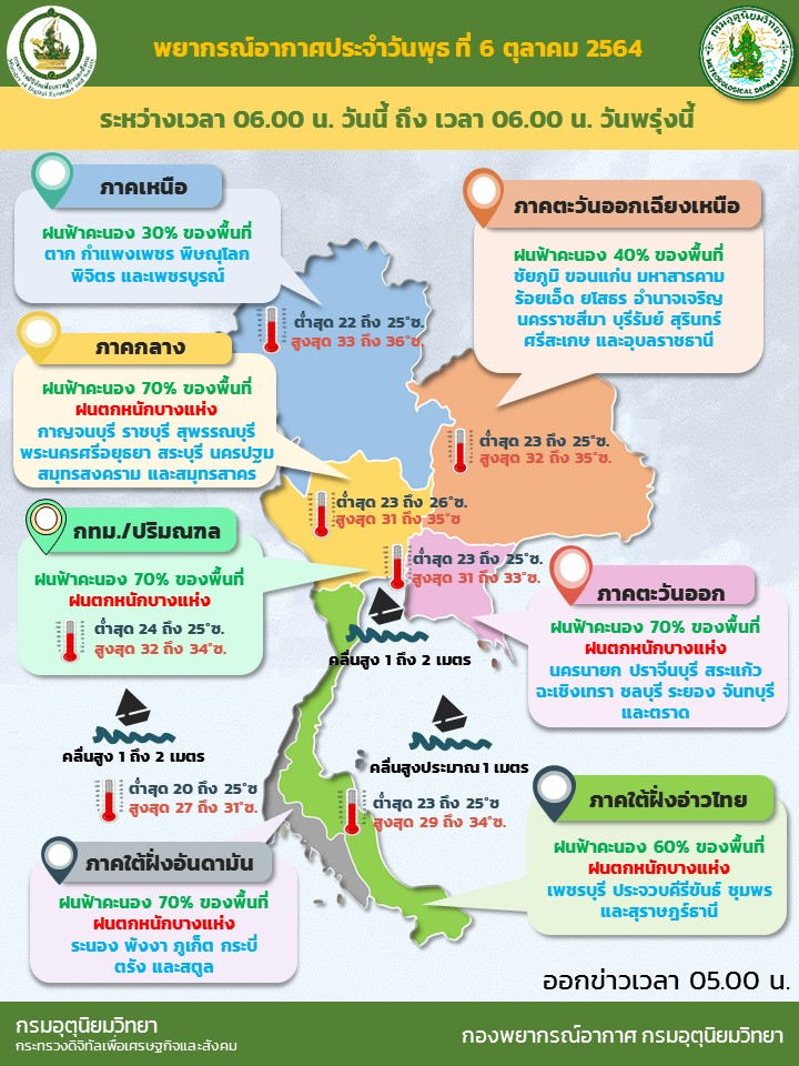 ลักษณะเช่นนี้ทำให้ภาคกลาง ภาคตะวันออก และภาคใต้ มีฝนตกหนักบางแห่ง ขอให้ประชาชนในบริเวณพื้นที่เสี่ยงภัยดังกล่าวระวังอันตรายจากฝนตกหนักและฝนที่ตกสะสม ซึ่งอาจทำให้เกิดน้ำท่วมฉับพลันและน้ำป่าไหลหลากในระยะนี้ไว้ด้วย อนึ่ง ในช่วงวันที่ 6-11 ต.ค. 64 หย่อมความกดอากาศต่ำกำลังแรงบริเวณทะเลจีนใต้ตอนกลางมีแนวโน้มที่จะทวีกำลังแรงขึ้น และเคลื่อนตัวเข้าใกล้เกาะไหหลำ ประเทศจีน ขอให้ประชาชนติดตามข่าวพยากรณ์อากาศจากกรมอุตุนิยมวิทยาอย่างใกล้ชิด