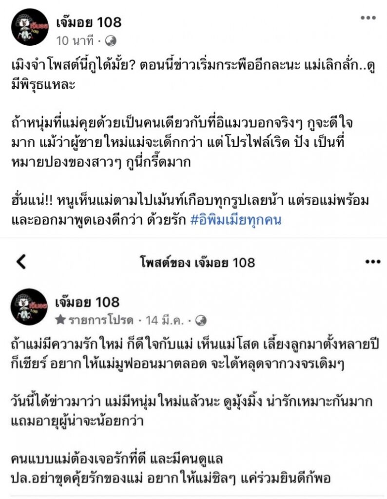 “ตอนนี้ข่าวเริ่มกระพืออีกละนะ แม่เลิกลั่ก..ดูมีพิรุธแหละ ถ้าหนุ่มที่แม่คุยด้วยเป็นคนเดียวกับที่อิแมวบอกจริงๆ กูจะดีใจมาก แม้ว่าผู้ชายใหม่แม่จะเด็กกว่า แต่โปรไฟล์เริ่ด ปัง เป็นที่หมายปองของสาวๆ กูนี่กรี๊ดมากซึ่งก็มีชาวโซเชียลแห่เข้าไปเดาเข้าไปเผือกกันอย่างอึกทึก และดูเหมือนผู้เข้ารอบเป็นแคนดิเดตครั้งนี้ คือสองหนุ่มตัวย่อ “ต.” และ “ท.” โดยนักสืบสายบันเทิงให้ข้อมูลต่อว่า หนุ่ม “ต.” เป็นรุ่นน้องแม่หลายปี บุคลิกใสๆ สไลต์โอปป้าและมีแม่เป็นผู้หญิงในสเปกเสียด้วย ด้านหนุ่ม “ท.” เยาว์วัยกว่าแค่ปีเดียวเอง อยู่ในแวดวงการทำงานที่แตกต่างจากแม่ และแม่มักจะไปกดไลค์และคอมเมนต์หนุ่มคนนี้อยู่บ่อยครั้ง