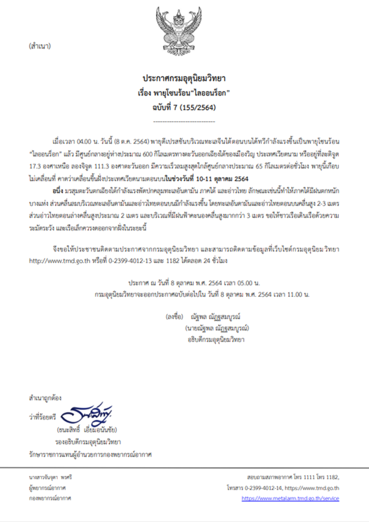 กรมอุตุนิยมวิทยาออกประกาศ ฉบับที่ 7 เรื่อง “พายุโซนร้อน”ไลออนร็อก” ทำฝนตกหนักในประเทศไทย