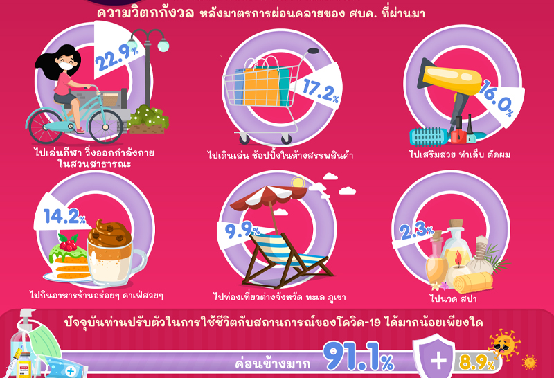 ทั้งนี้ ร้อยละ 50.2 มองว่า ในภาพรวม สุขภาพจิต ความเครียด ความวิตกกังวล เมื่อเทียบกับปีที่ผ่านมา ว่าแย่กว่าเดิม ขณะที่ ร้อยละ 41.9 เห็นว่าเหมือนเดิม และร้อยละ 7.9 เห็นว่าดีกว่าเดิม โดยร้อยละ 22.9 ระบุ หลัง ศบค.ผ่อนคลายมาตรการ ไปเล่นกีฬา วิ่งออกกำลังกายในสวนสาธารณะต่างๆเพื่อคลายเครียด ,ร้อยละ 17.2 ไปเดินเล่น ช็อปปิ้ง ในห้างสรรพสินค้า และร้อยละ 16.0 ไปเสริมสวย ทำเล็บ ตัดผม แต่ร้อยละ 44.9 ระบุอยู่บ้านไม่ไปไหน เพราะกลัวติดโควิด-19