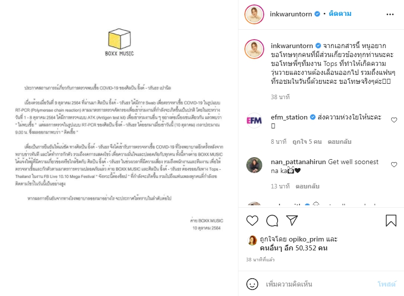 “เมื่อวันที่ 9 ตุลาคม ที่ผ่านมา อิ้งค์ และทีมงานได้ทำการ Swab เพื่อตรวจหาเชื้อโควิด-19 ในรูปแบบของ RT-PCR ตามมาตรการตรวจคัดกรอง เพื่อเข้าร่วมงานที่กำลังจะเกิดขึ้นตามปกติ โดยในระหว่างวันที่ 1-8 ตุลาคม ที่ผ่านมา ได้มีการตรวจแบบ ATK เพื่อเข้าร่วมงานอื่นๆ อย่างต่อเนื่อง ซึ่งมีผลเป็นลบ “ไม่พบเชื้อ” แต่เมื่อช่วงเช้าที่ผ่านมา เวลา 09.00 รับแจ้งผลตรวจ RT-PCR ที่มีผลเป็นบวก “พบเชื้อโควิด-19”