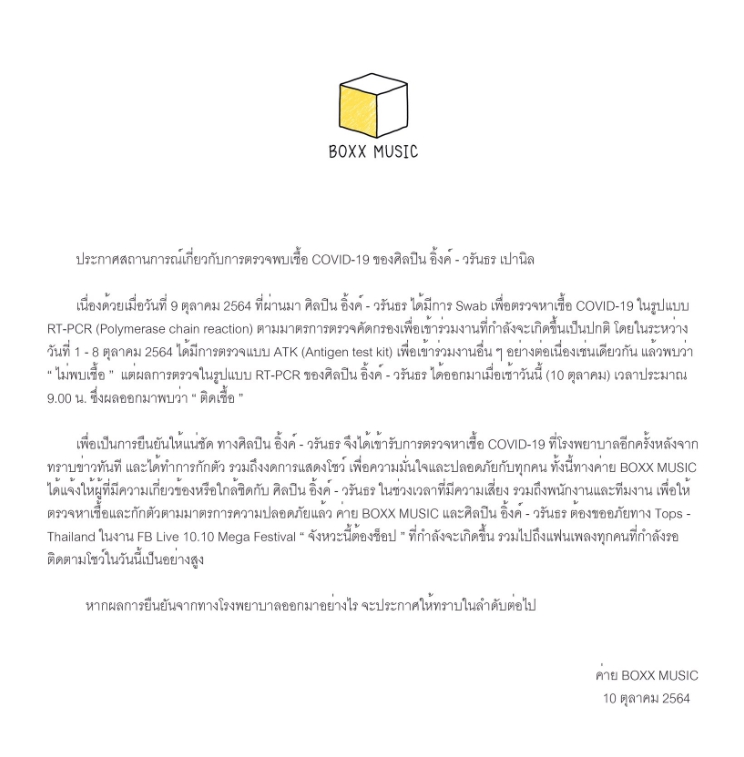 ค่าย BOXX MUSIC ออกหนังสือเพื่อแจ้งข่าวถึงแฟนเพลงของ อิ้งค์-วรันธร เปานิล ศิลปินสาวชื่อดัง หลังจากผลตรวจ RT-PCR ที่ตรวจหาเชื้อก่อนการทำงาน ซึ่งเธอได้ตรวจหาเชื้อเมื่อวันที่ 9 ธันวาคม 2564 และทราบว่าผลตรวจเป็นบวก ติดเชื้อโควิด-19 ในช่วงเช้าวันที่ 10 ตุลาคม ที่ผ่านมา และระหว่างนี้กำลังรอผลตรวจซ้ำที่โรงพยาบาล