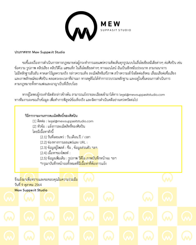 ประกาศจากมิว ศุภศิษฏ์ สตูดิโอ ทางสตูดิโอได้มีการดำเนินคดีทางกฏหมายอาญากับผู้กระทำความผิดไปแล้วส่วนนึง หากพบเห็นเพิ่มเติมรบกวนแจ้งเข้ามาตามรายละเอียดดังต่อไปนี้
