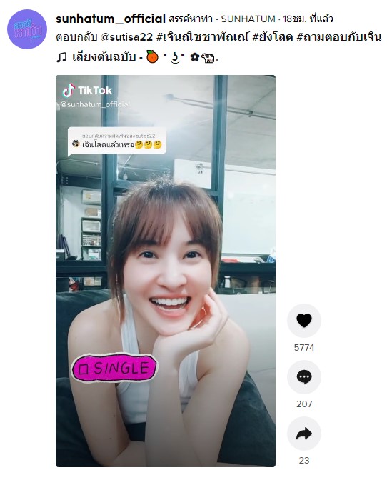 ล่าสุดสาวเจินก็ทำแฟนตกอกตกใจตามๆกัน หลังจากได้ออกมาเปิดเผยผ่าน TiKTok ที่ใช้ชื่อว่า sunhatum_official ว่าสถานะตอนนี้กลับมาโสดแล้ว หลังจากมีถูกชาวเน็ตรายหนึ่งเข้ามาถาม ว่าโสดแล้วจริงเหรอ? ซึ่งสาวเจินก็ได้ตอบกลับเป็นวิดีโอว่า “โสดแล้วค่ะ โสดมานานแล้วค่ะ” พร้อมเปิดเพลงยังโสดไปด้วย