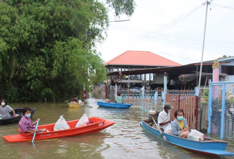 ชาวบ้านต่างพากันพายเรือมารับถุงยังชีพกันเป็นจำนวนมาก จุดแรกที่วัดจันทน์กะพ้อ ต.บางเตย อ.สามโคก จ.ปทุมธานี ทางนายศุภชัย นพขำ ส.ส.ปทุมธานี เขต 2 พรรคเพื่อไทย ได้นำรถ 6 ล้อบรรทุกถุงยังชีพเข้ามาแจกบริเวณหน้าวัดซึ่งยังไม่มีน้ำท่วมขังและเดินทางต่อไปยังตลาดอิงน้ำสามโคกแหล่งท่องเที่ยวชื่อดังของ อ.สามโคก ซึ่งมีน้ำท่วมขังสูงติดต่อกันมาหลาย โดยประชาชนภายในตลาดอิงน้ำ ได้พายเรือและเดินลุยน้ำเพื่อมารับถุงยังชีพที่นำมาแจก หลังจากนั้นได้เดินทางต่อไปยังวัดสามโคก ต.สามโคก อ.สามโคก จ.ปทุมธานี ซึ่งรอบวัดเป็นชุมชนและมีประชาชนอาศัยอยู่กว่า 250 หลังคาเรือนและส่วนใหญ่เป็นพื้นที่ริมคลองและติดแม่น้ำเจ้าพระยา ทำให้มีน้ำท่วมขังสูงประชาชนต้องใช้เรือในการสัญจร