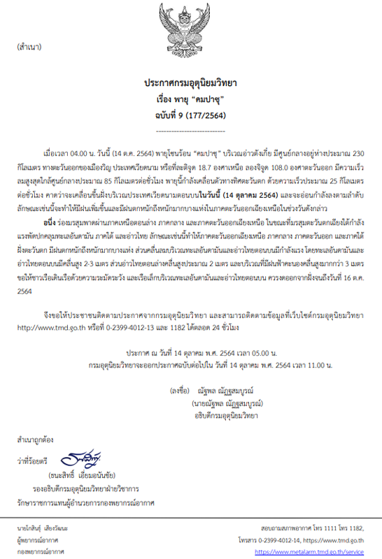 กรมอุตุนิยมวิทยา ออกประกาศ ฉบับที่ 9 เรื่อง พายุ “คมปาซุ”