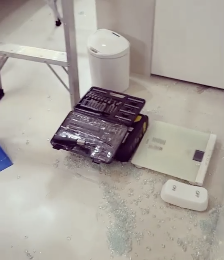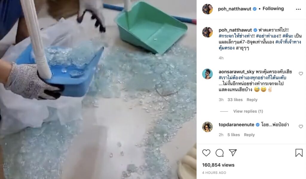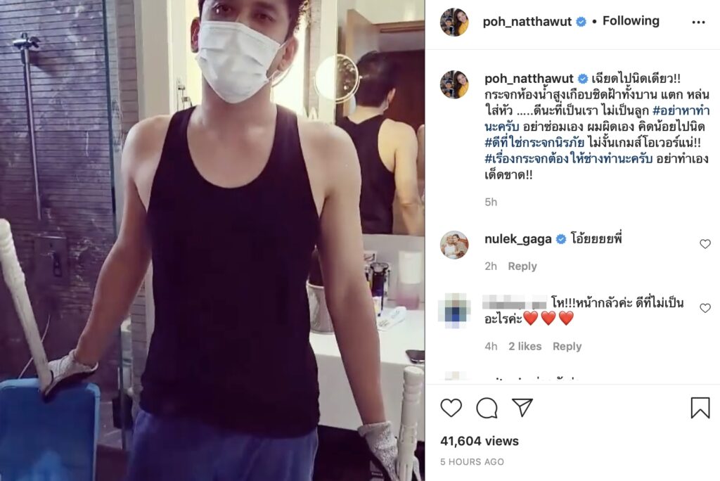 พร้อมเล่าเหตุการณ์ที่เกิดขึ้น เพื่อเป็นอุทาหรณ์ บอกว่าอย่าคิดจะซ่อมเอง ระบุข้อความว่า “เฉียดไปนิดเดียว!! กระจกห้องน้ำสูงเกือบชิดฝ้าทั้งบาน แตก หล่นใส่หัว ดีนะที่เป็นเรา ไม่เป็นลูก #อย่าหาทำนะครับ อย่าซ่อมเอง ผมผิดเอง คิดน้อยไปนิด #ดีที่ใช่กระจกนิรภัย ไม่งั้นเกมส์โอเวอร์แน่!! #เรื่องกระจกต้องให้ช่างทำนะครับ อย่าทำเองเด็ดขาด!!”