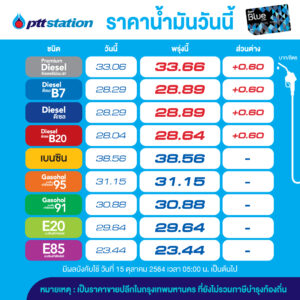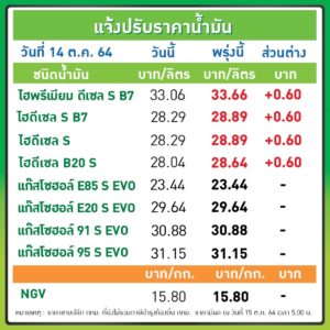 บมจ.ปตท.น้ำมันและการค้าปลีก (OR) และ บมจ.บางจาก คอร์ปอเรชั่น (BCP) ประกาศปรับขึ้นราคาขายปลีกน้ำมันกลุ่มดีเซลทุกชนิด 60 สต. คงกลุ่มเบนซินและแก๊สโซฮอล์ มีผลพรุ่งนี้ 15 ต.ค.2564 ตั้งแต่เวลา 05.00 น. เป็นต้นไป