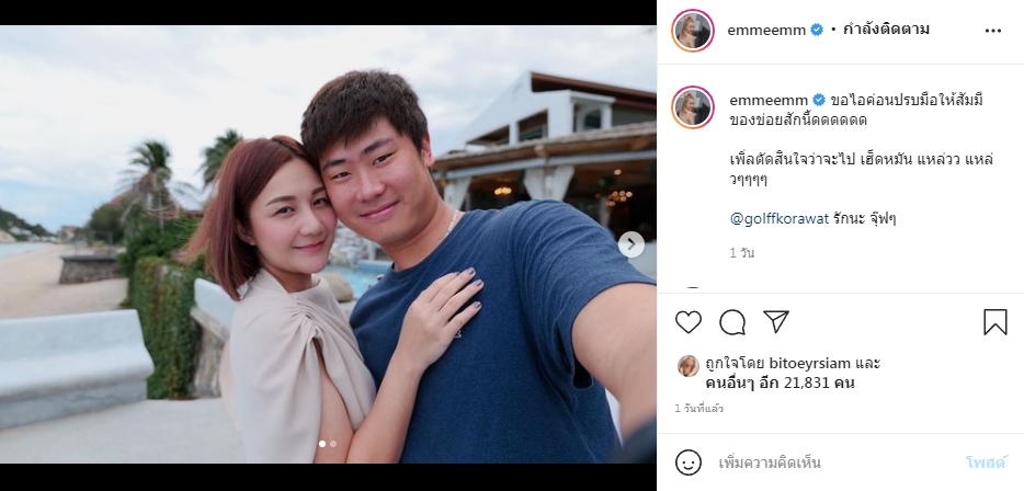 ล่าสุดสาวเอ็ม บุษราคัม ได้ออกมาตอบข้อสงสัยชัดเจน หลังจากโพสต์ภาพคู่สามี ลงอินสตาแกรมส่วนตัวพร้อมเขียนแคปชั่นที่บอกเรื่องการเตรียมปิดอู่ไว้ว่า “ขอไอค่อนปรบมือให้สัมมีของข่อยสักนี้ดดดดดด เพิ่ลตัดสินใจว่าจะไป เฮ็ดหมัน แหล่วว แหล่วๆๆๆๆ @golffkorawat รักนะ จุ๊ฟๆ”