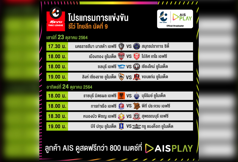 แฟนบอลชาวไทยร่วมรับชมฟุตบอลไทยแบบจัดเต็มได้ทาง AIS PLAY ไม่ว่าจะเป็นฟุตบอลไทยลีก T1-3, ช้างเอฟเอ คัพ, รีโว่ ลีก คัพ, ฟุตบอลทีมชาติไทยชาย หญิง, ฟุตซอลทีมชาติไทย และฟุตซอลไทยลีก ได้ฟรี ไม่มีค่าใช้จ่าย ไม่ต้องสมัครแพ็กเกจเพิ่มเติม