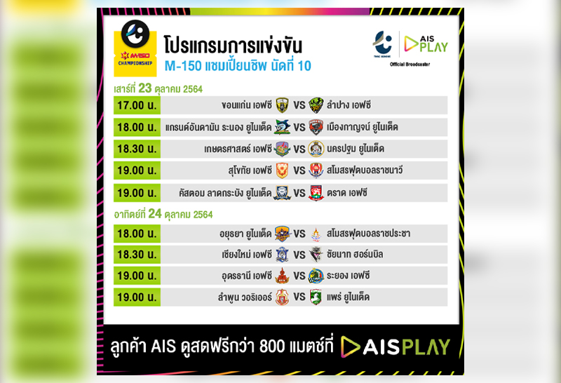โปรแกรมฟุตบอล เอ็ม-150 แชมเปี้ยนชิพ มีดังนี้