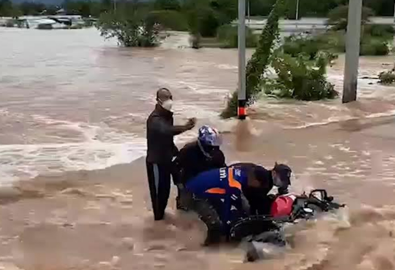 จนท.เร่งช่วยชีวิตชาวต่างชาติขับบิ๊กไบค์ฝ่าน้ำท่วม