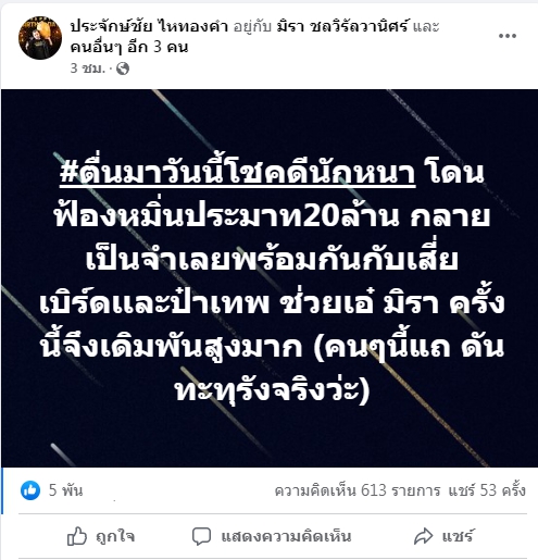 ล่าสุดมีประเด็นมาให้ชาวเน็ตตามต่ออีกแล้วหลัง นายห้างไหทองคำ ออกมาโพสต์ข้อความเช้าวันนี้ (21 ต.ค. 64. ) โดยมีเนื้อหาว่า ตื่นมาวันนี้โชคดีนักหนา โดนฟ้องหมิ่นประมาท20ล้าน กลายเป็นจำเลยพร้อมกันกับเสี่ยเบิร์ดเเละป๋าเทพ ช่วยเอ๋ มิรา ครั้งนี้จึงเดิมพันสูงมาก (คนๆนี้แถ ดันทะทุรังจริงว่ะ)