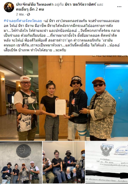 ต่อมา นายห้างประจักษ์ชัย ยังได้โพสต์ข้อความผ่านเฟซบุ๊คอีกว่า ” #จำเลยที่ศาลจังหวัดเลย -เอ๋ มิรา เรา3คนตกลงร่วมกัน จะสร้างงานเเละต่อยอด ให้เอ๋ มิรา มีงาน มีอาชีพ มีรายได้หลังจากมีกระเเสไปออกรายการดังมา….ให้กำลังใจ ให้คำแนะนำ และปกป้องน้องเอ๋ …วันนี้พวกเราทั้ง4คน กลายเป็นจำเลย ด้วยกันเรียบร้อย ….ที่ผ่านมาเรายั้งใจ ยั้งมือมาตลอด คิดหน้าคิดหลัง จะให้เอ๋ ฟ้องดีไม่ฟ้องดี สงสารคำว่า”ลูก คำว่าคนเคยรักกัน “เรามันคนนอก เขาดีกัน..เราจะเป็นหมาหัวเน่า….แต่วันนี้คงยั้งมือ ไม่ได้เเล้ว …น้องเอ๋ เสี่ยเบิร์ด ป๋าเทพ ทำใจให้สบาย …นะครับ”