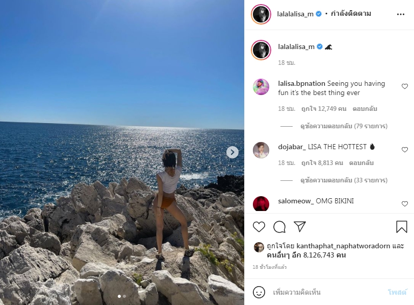 ล่าสุด ลิซ่า ได้จัดทริปเดินทางไปทำงานและเที่ยวพักผ่อนที่ยุโรป แต่ที่ทำเอาแฟนคลับในโลกออนไลน์แตกตื่น เมื่อเจ้าตัวออกมาโพสต์ภาพอวดความแซ่บในชุดบิกินี่ตัวจิ๋ว ใส่เพียงเสื้อยืดทับเอวลอย ยืนโพสท่าโชว์สะโพกผายปัง ๆ แบบ Sexy girl โชว์เรียวขายาวอยู่บนโขดหิน เรียกว่าเห็นแค่ข้างหลังก็ยังแซ่บเว่อร์ เรียกเสียงกรี๊ดสนั่นไอจี