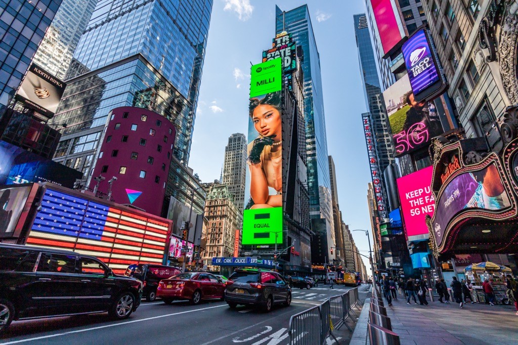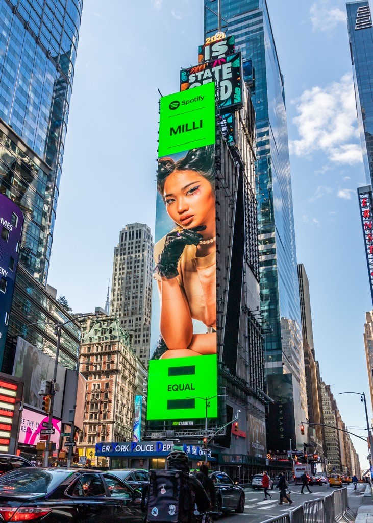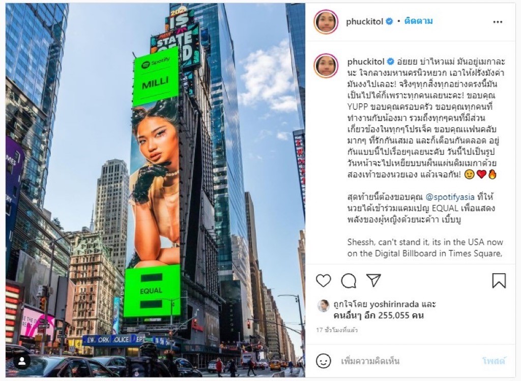 ต๊าซซสุด!!!อะไรสุด!!! สำหรับ แร็พเปอร์สาวสุดฮอต “มิลลิ-ดนุภา คณาธีรกุล” จากค่าย YUPP! ที่ล่าสุดฮอตไกลข้ามประเทศ ถูกรับเลือกให้เป็นศิลปินที่ได้ขึ้นป้ายบิลบอร์ดยักษ์ใจกลางไทม์สแควร์ นิวยอร์ก ประเทศสหรัฐอเมริกา ได้รับเลือกจาก Spotify ให้เป็นตัวแทนศิลปินหญิงจากประเทศไทยอีกคนหนึ่งใน แคมเปญ Equal ที่นำเสนอผลงานเพลงจากศิลปินหญิงที่โดดเด่นจากทั่วทุกมุมโลก จัดขึ้นเพื่อเฉลิมฉลองวันสตรีสากล และสนับสนุนความเท่าเทียมของผู้หญิง ซึ่งมิลลิก็สุดปลื้ม ลงไอจีอวยยศให้มงลงเก๋ๆ!!