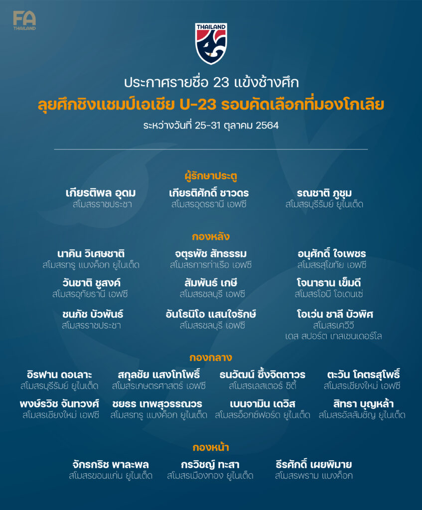 ฟุตบอลทีมชาติไทย รุ่นอายุไม่เกิน 23 ปี ภายใต้การดูแลของ “มาดามแป้ง” นวลพรรณ ล่ำซำ ผู้จัดการทีม พร้อมด้วย “โค้ชโย่ง” วรวุธ ศรีมะฆะ หัวหน้าผู้ฝึกสอน และ “โค้ชโชค” โชคทวี พรหมรัตน์ ผู้ช่วยผู้ฝึกสอน ประกาศรายชื่อ 23 นักเตะ ชุดทำศึกฟุตบอลชิงแชมป์เอเชีย 2022 รอบคัดเลือก ที่ประเทศมองโกเลีย ระหว่างวันที่ 21-31 ตุลาคม 2564