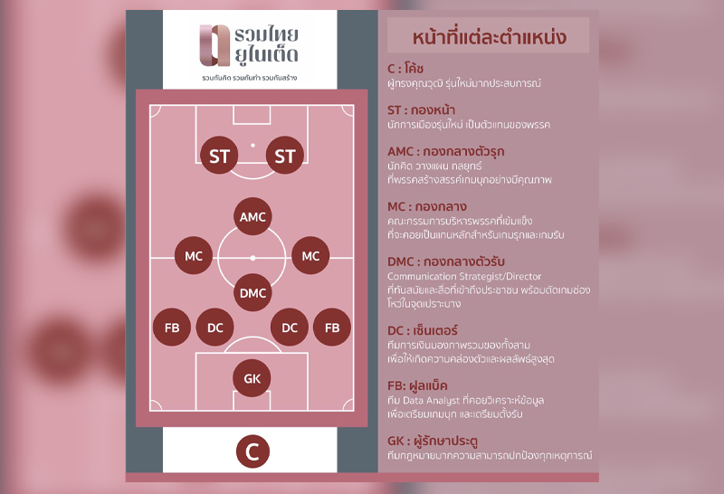 ส่วน คำว่า “ยูไนเต็ด” นอกจากจะสื่อถึงการรวมกันเป็นหนึ่งเดียวแล้ว ยังสื่อถึงวิธีการบริหารพรรคว่าเราบริหารเหมือนทีมฟุตบอล ในทีมของเราจะไม่มีซูเปอร์แมน หรือ วันแมนโชว์ แต่จะทำงานเป็นทีม ที่มีทั้ง กองหน้า กองกลาง กองหลัง มีตัวสำรองไว้เปลี่ยนเวลาตัวเต็งบาดเจ็บ มีโค้ชที่มีประสบการณ์คอยวางแผนแนะนำ และที่ขาดไม่ได้คือ แฟนคลับหรือประชาชนที่มาร่วมส่งกำลังใจช่วยสนับสนุนเรา ซึ่งทั้งหมดนี้รวมอยู่ในคำว่า “ยูไนเต็ด” ดังนั้น “รวมไทยยูไนเต็ด” จึงเป็นพื้นที่ปลอดภัยของคนไทยทุกคนที่จะมาแลกเปลี่ยนความคิดเห็นและสร้างฉันทมติร่วมกันอย่างสันติวิธี