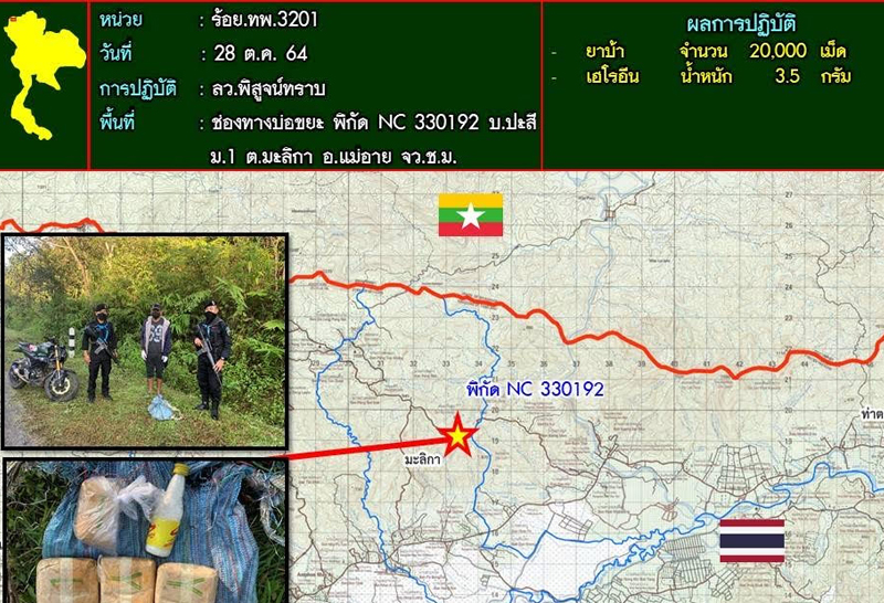กองบังคับการควบคุมทหารพรานศูนย์ปฏิบัติการกองทัพภาคที่ 3 กองกำลังผาเมือง นำโดย ร.ท. เทพฤทธิ์ สมัครเขตวิทย์ หัวหน้าชุดกองร้อยทหารพรานที่ 3201 กองบังคับการควบคุมทหารพรานศูนย์ปฏิบัติการกองทัพภาคที่ 3 ( ร้อย.ทพ.3201 บก.ควบคุม ทพ.ศปก.ทภ.3 ) นำกำลังชุดปฏิบัติการออกลาดตระเวนตามพื้นที่รับผิดชอบ เพื่อสกัดกั้นการลักลอบค้ายาเสพติด การลักลอบเข้าเมืองโดยผิดกฎหมาย บริเวณช่องทางบ่อขยะ บ.ปะสี ม.1 ต.มะลิกา อ.แม่อาย จังหวัดเชียงใหม่ ขณะเดินลาดตระเวน ได้ตรวจพบผู้ต้องสงสัย ขับขี่รถจักรยานยนต์เข้ามารับสิ่งของ บริเวณทางหลวงหมายเลข 1314 เจ้าหน้าที่จึงได้ส่งสัญญาณให้หยุดเพื่อขอตรวจค้น แต่บุคคลดังกล่าว ได้ทิ้งเป้และ ขับขี่รถจักรยานยนต์หลบหนีไปได้ จากการตรวจสอบ พบของกลางยาเสพติดให้โทษประเภทที่ 1 (ยาบ้า) จำนวน 10 มัดๆ ละ 2,000 เม็ด รวม 20,000 เม็ด และ ยาเสพติดให้โทษประเภทที่ 1 (เฮโรอีน) 1 ขวดสปอนเซอร์ น้ำหนัก 3.5 กรัม หน่วยจะได้ติดตามและขยายผลในพื้นที่ต่อไป