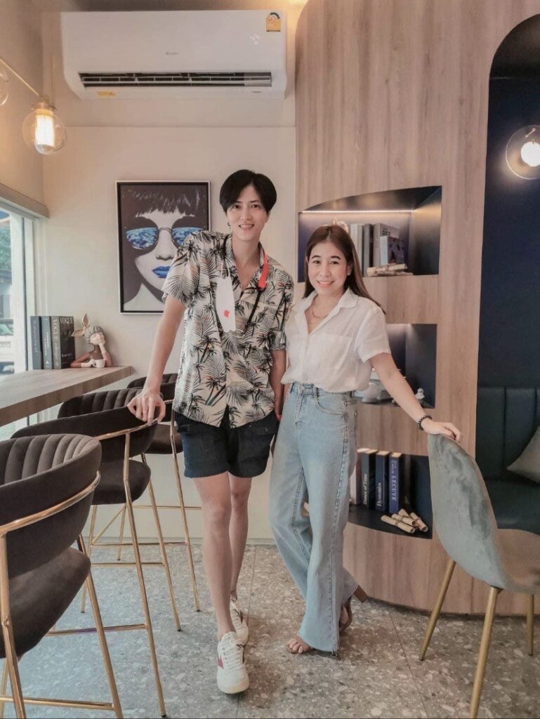 “เดิมตรงนี้ก็คือบริเวณเรือนหอเก่าของธัญญ่ากับพี่เป๊ก ซึ่งเอาพื้นที่ส่วนนึงมารีโนเวทเป็น BB Clinic ไปก่อนแล้ว และเรายังมีพื้นที่ด้านหน้าเหลืออยู่ ปุ๊กกี้-น้องสาวพี่เป๊ก (สินีนารถ เองตระกูล) ก็มีไอเดียว่าน่าจะเปิดเป็นร้านคาเฟ่เก๋ๆ จะได้เอาไว้รองรับลูกค้าที่มารอใช้บริการที่ BB Clinic ได้นั่งเล่นชิลล์ๆ แล้วที่หลายคนน่าจะรู้กันแล้วก็คือเรามีครัวซองต์สูตรของคุณพ่อพี่เป๊ก ซึ่งขึ้นชื่อว่าอร่อยมากๆ และเป็นที่ติดใจของหลายๆ คน ก็เห็นด้วยกับกี้เลยตัดสินใจทำร้านนี้ขึ้นมา ก็ใช้ช่วงเวลาที่ล็อคดาวน์โควิดหลังสงกรานต์เริ่มออกแบบ และตกแต่งจนออกมาเป็นร้านในสไตล์โมเดิร์น-มินิมอล ซึ่งก่อนที่จะเปิดร้านก็แอบหวั่นใจว่าจะไปรอดมั้ยเพราะเปิดในช่วงเศรษฐกิจแบบนี้ แต่ผ่านมาเดือนนึงตอนนี้บอกได้เลยว่าโล่งใจขึ้นเยอะ เพราะได้รับการตอบรับค่อนข้างดีเลย ทุกคนชมว่าร้านสวย ที่สำคัญคือกาแฟกับครัวซองต์อร่อยมาก”