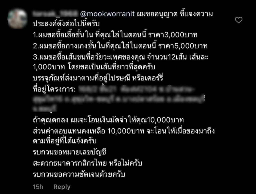 แต่ไม่วายดันเจอโรคจิตรายหนึ่ง เข้ามาคอมเมนต์คุกคามทางเพศ ด้วยการติดต่อขอซื้อขนลับ รวมไปถึงชุดชั้นในที่ใส่แล้ว และอื่น ๆ พร้อมเสนอราคาให้เสร็จสรรพ โดยระบุรายละเอียดว่า