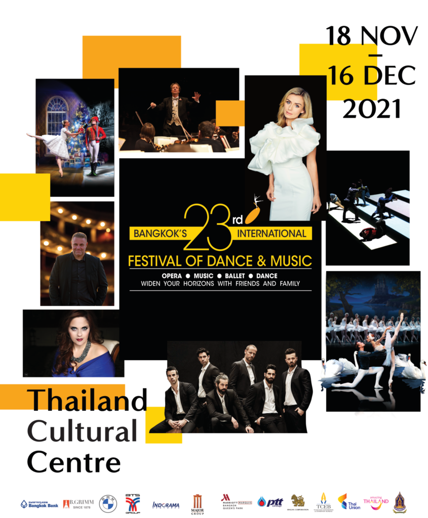 มาร่วมเฉลิมฉลองจิตวิญญาณของมนุษยชาติ สานต่องานสร้างสรรค์ และร่วมกันสร้างแรงบันดาลใจ ในงานมหกรรมศิลปะการแสดงและดนตรีนานาชาติ กรุงเทพฯ ครั้งที่ 23 ณ หอประชุมใหญ่ ศูนย์วัฒนธรรมแห่งประเทศไทย ตั้งแต่ 18 พฤศจิกายน ถึง 16 ธันวาคม พ.ศ.2564 นี้สามารถสำรองที่นั่งได้แล้วตั้งแต่วันนี้ทาง Thai Ticket Major: www.thaiticketmajor.com  และเคาน์เตอร์ Thai Ticket Major ทุกสาขาทั้งนี้สงวนสิทธิ์ในการเข้าชมการแสดงสำหรับผู้ที่ได้รับการฉีดวัคซีนป้องกันโควิด-19 ครบสองเข็มแล้วเท่านั้น ผู้ชมต้องนำเอกสารยืนยันต่อเจ้าหน้าที่ก่อนเข้าชมการแสดง โดยสามารถเปิดเอกสารรูปแบบดิจิทัลได้จากโปรแกรมหมอพร้อม