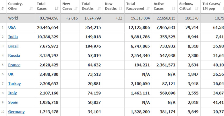 ประเทศที่พบรายงานผู้ติดเชื้อสูงสุด 5 อันดับแรก ได้แก่ 1.สหรัฐอเมริกา มีผู้ติดเชื้อ 20,445,654 ราย เสียชีวิต 354,215 ราย รักษาหาย 12,125,806 ราย 2.อินเดีย มีผู้ติดเชื้อ 10,286,329 ราย เสียชีวิต 149,018 ราย รักษาหาย 9,881,786 ราย 3.บราซิล มีผู้ติดเชื้อ 7,675,973 ราย เสียชีวิต 194,976 ราย รักษาหาย 6,747,065 ราย 4.รัสเซีย มีผู้ติดเชื้อ 3,159,297 ราย เสียชีวิต 57,019 ราย รักษาหาย 2,554,340 ราย 5.ฝรั่งเศส มีผู้ติดเชื้อ 2,620,425 ราย เสียชีวิต 64,632 ราย รักษาหาย 194,221 ราย