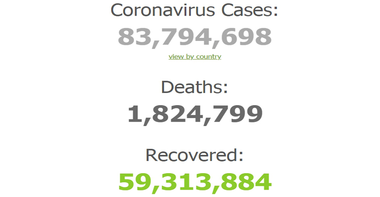 เว็บไชต์ Worldometers รายงานสถานการณ์ไวรัสโควิด-19 ประจำวันที่ 1 มกราคม 2564 ช่วงเวลาประมาณ 09.12 น. ตามเวลาประเทศไทย พบมีผู้ป่วยติดเชื้อทั่วโลก รวม 83,794,698 ราย เสียชีวิต 1,824,799 ราย รักษาหาย 59,313,884 ราย