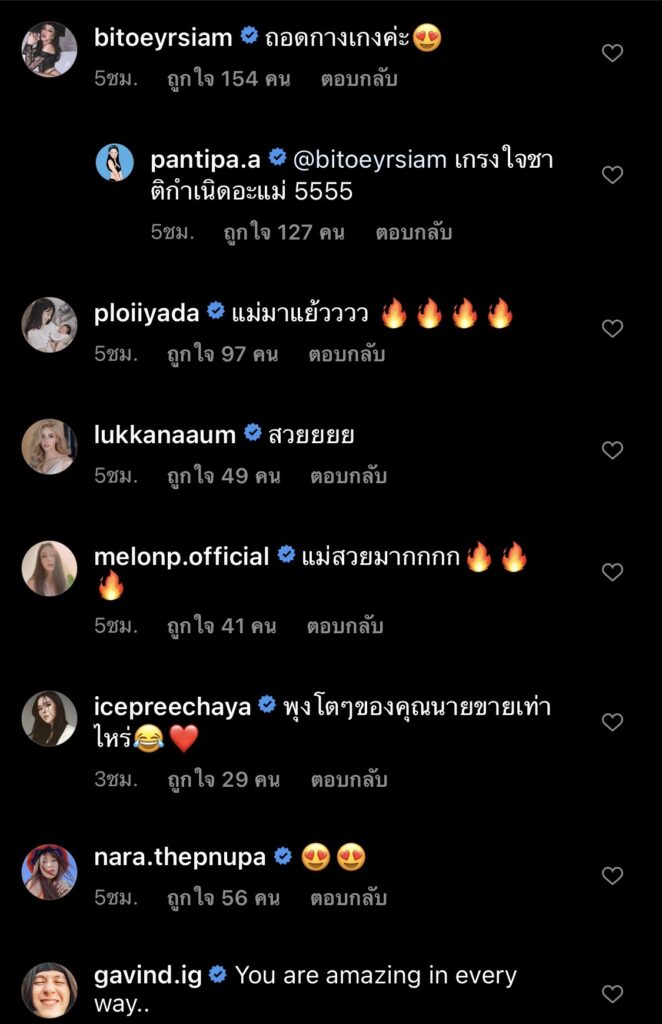 งานนี้สามีหนุ่ม กวินท์ กHเข้ามาคอมเมนต์ชื่นชมภรรยาบอกว่า “You are amazing in every way” รวมถึงเพื่อนพ้องคนในวงการ ก็ยังอดไม่ได้ที่จะเข้ามากดไลก์ และคอมเมนต์ชื่นชมในความสวยความแซ่บของว่าที่คุณแม่ที่ไม่เคยแผ่วเลยจริงๆ