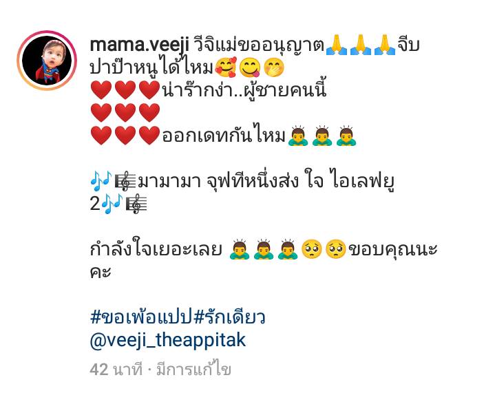 ทำเอาชาวเน็ตส่งเสียงเชียร์สนั่นโซเชียลเลยทีเดียว หลังจากที่นักแสดงสาวอย่าง “กุ้งพลอย กนิษฐรินทร์ พัชรภักดีโชติ” หรือ “ติ๊ก บิ๊กบราเธอร์” ออกมาอวดโมเมนต์น่ารักๆ ด้วยการโพสต์ภาพขณะกำลังวิดีคอลคุยกับลูกสาว “น้องวีจิ” พร้อมกับแปะภาพคู่ระหว่างน้องวีจิและอดีตสามี “หนุ่ม ศรราม เทพพิทักษ์” ลงอินสตาแกรมส่วนตัว พร้อมกับแนบแคปชั่นประกาศเดินหน้าจีบพ่อของลูกแบบตรงไปตรงมาว่า… “วีจิแม่ขออนุญาต จีบปะป๊าหนูได้ไหม น่าร๊ากง่า..ผู้ชายคนนี้ ออกเดทกันไหม มามามาจุฟทีหนึ่งส่งใจไอเลฟยู กำลังใจเยอะเลย ขอบคุณนะคะ #ขอเพ้อแปป #รักเดียว”