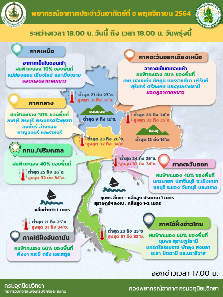 ภาคตะวันออกเฉียงเหนือของประเทศไทยแล้ว คาดว่าจะแผ่เข้าปกคลุมภาคเหนือ ภาคกลาง ภาคตะวันออก รวมทั้งกรุงเทพมหานครและปริมณฑล ในวันพรุ่งนี้ (9 พ.ย. 64) ลักษณะเช่นนี้ทำให้บริเวณภาคตะวันออกเฉียงเหนือมีอากาศเย็นกับมีลมแรง โดยอุณหภูมิจะลดลง 3-5 องศาเซลเซียส ส่วนภาคเหนือ ภาคกลาง รวมทั้งกรุงเทพมหานครและปริมณฑล ภาคตะวันออก อ่าวไทยและภาคใต้ มีมรสุมตะวันออกเฉียงเหนือและลมตะวันออกพัดปกคลุม ทำให้บริเวณดังกล่าวมีฝนฟ้าคะนองเกิดขึ้น ขอให้ประชาชนบริเวณประเทศไทยตอนบนดูแลรักษาสุขภาพเนื่องจากอากาศที่หนาวเย็นลงไว้ด้วย