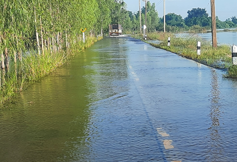 มวลน้ำก้อนโตจากชัยภูมิ ถึง จ.อุบลฯ ที่บ้านแก้งโพธิ์ ต.ค้อทอง อ.เขื่องใน เป็นจุดแรก น้ำเอ่อล้นท่วมผนังกั้นน้ำ