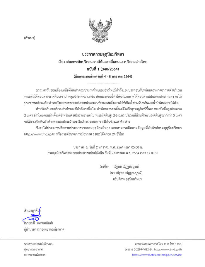 ประกาศกรมอุตุนิยมวิทยา “ฝนตกหนักบริเวณภาคใต้และคลื่นลมแรงบริเวณอ่าวไทย (มีผลกระทบตั้งแต่วันที่ 4 – 8 มกราคม 2564)” ฉบับที่ 1 ลงวันที่ 02 มกราคม 2564 มรสุมตะวันออกเฉียงเหนือที่พัดปกคลุมประเทศไทยและอ่าวไทยมีกำลังแรง ประกอบกับหย่อมความกดอากาศต่ำบริเวณทะเลจีนใต้ตอนล่างจะเคลื่อนเข้าปกคลุมประเทศมาเลเซีย ลักษณะเช่นนี้ทำให้บริเวณภาคใต้ตอนล่างมีฝนตกหนักบางแห่ง ขอให้ประชาชนบริเวณดังกล่าวระวังผลกระทบจากฝนตกหนักและฝนที่ตกสะสมซึ่งอาจทำให้เกิดน้ำท่วมฉับพลันและน้ำป่าไหลหลากไว้ด้วย สำหรับคลื่นลมบริเวณอ่าวไทยจะมีกำลังแรงขึ้น โดยอ่าวไทยตอนบนตั้งแต่จังหวัดสุราษฎร์ธานีขึ้นมา ทะเลมีคลื่นสูงประมาณ 2 เมตร อ่าวไทยตอนล่างตั้งแต่จังหวัดนครศรีธรรมราชลงไป ทะเลมีคลื่นสูง 2-3 เมตร บริเวณที่มีฝนฟ้าคะนองคลื่นสูงมากกว่า 3 เมตร ขอให้ชาวเรือเดินเรือด้วยความระมัดระวังและเรือเล็กควรงดออกจากฝั่งในช่วงเวลาดังกล่าว จึงขอให้ประชาชนติดตามประกาศจากกรมอุตุนิยมวิทยา และสามารถติดตามข้อมูลที่เว็บไซต์กรมอุตุนิยมวิทยา http://www.tmd.go.th หรือสายด่วนพยากรณ์อากาศ 1182 ได้ตลอด 24 ชั่วโมง