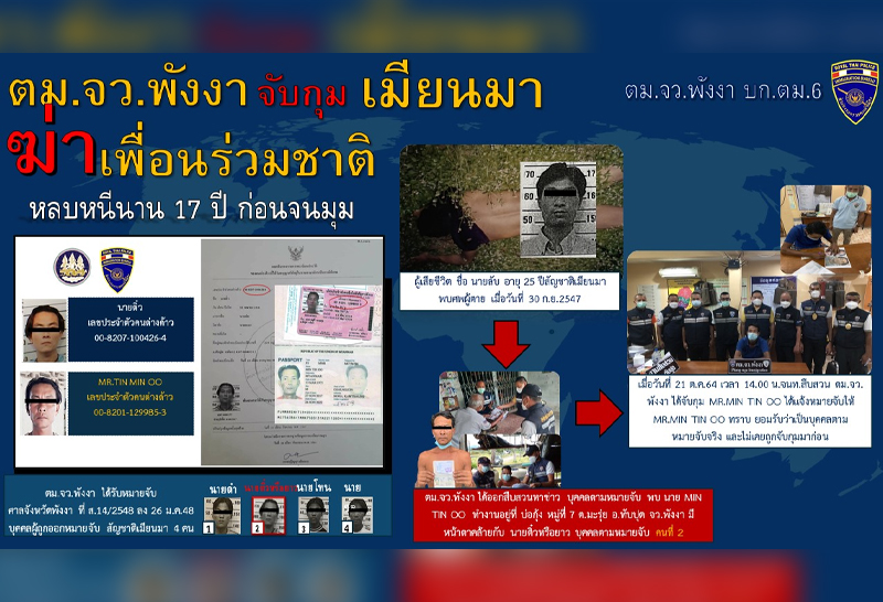 เมื่อวันที่ 9 พ.ย. 64 ที่สำนักงานตรวจคนเข้าเมือง (สตม.) พล.ต.ต.อาชยน ไกรทอง รอง ผบช.สตม. แถลงผลการจับกุมคนร้าย คือ นายติ๋ว หรือยาว สัญชาติ เมียนมา อายุ 46 ปี หมายจับศาลจังหวัดพังงา ที่ ส.12/2548 ลง 26 ม.ค.48 ต้องหาว่ากระทำผิดฐาน “ร่วมกันฆ่าผู้อื่นโดยเจตนาและไตร่ตรองไว้ก่อน”