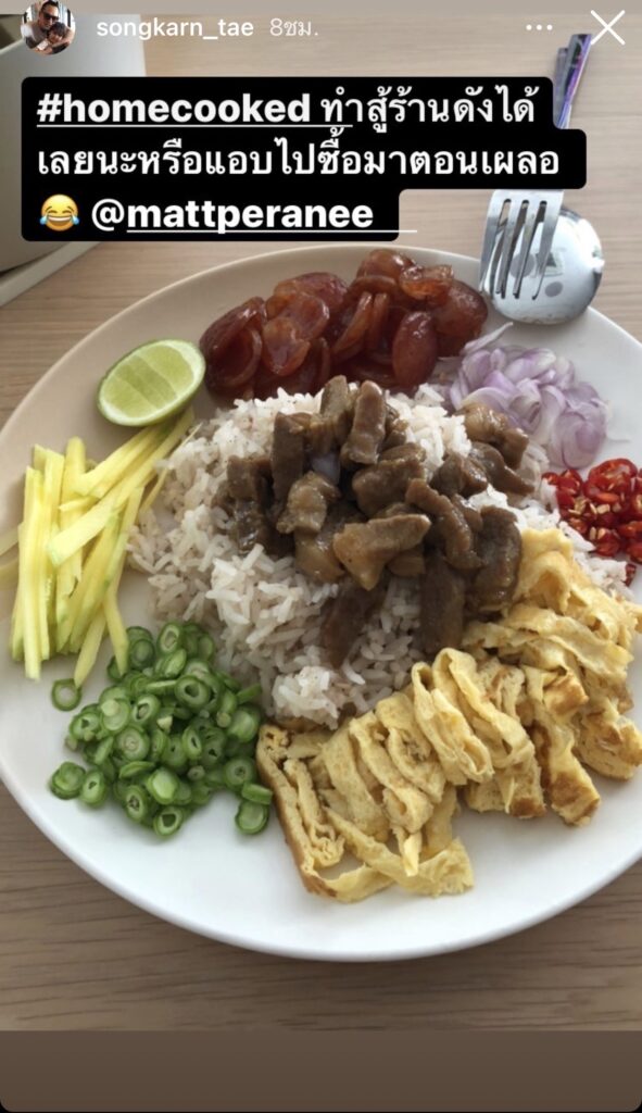 อย่างล่าสุดทำเอาหลายคนแอบแปลกใจ ไม่อยากจะเชื่อว่านางเอกสาวอย่างแมท ภีรนีย์ จะสวมบทแม่ศรีเรือน เข้าครัวทำอาหารได้ออกมาน่าทานขนาดนี้ เมื่อหนุ่มสงกรานต์โพสต์ไอจีสตรอรี่รีวิวข้าวคลุกกะปิฝีมือแฟนสาว พร้อมกับบอกว่า “#homecooked ทำสู้ร้านดังได้เลยนะ หรือแอบไปซื้อมาตอนเผลอ”