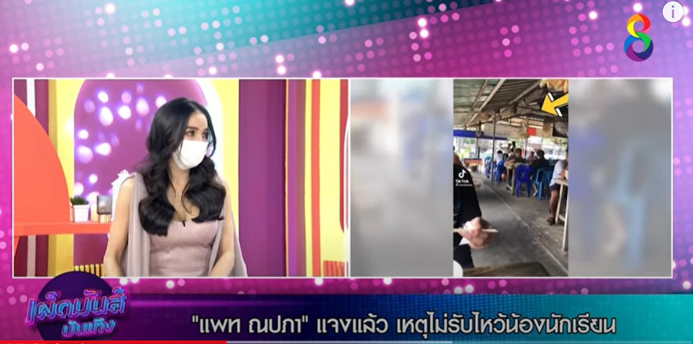 แพท : หนึ่ง คือคนที่ถ่ายคลิปเป็นคนน่ารัก น่าจะห่างประมาณ 3 โต๊ะได้ แล้วแคปชั่นที่เค้าลงคือ เจอพี่แพทตัวจริงโคตรสวยเลย เสร็จแล้วมีคนที่เข้าไปดู ติ๊กต๊อกของน้องคนที่โพสต์ แล้วไปดราม่าว่าไม่เห็นรับไหว้ เสร็จแล้วก็เอาไปดราม่าไม่เห็นรับไหว้น้องเค้าเลย แล้วก็เอาคลิปน้องเค้าไปรีโพสต์