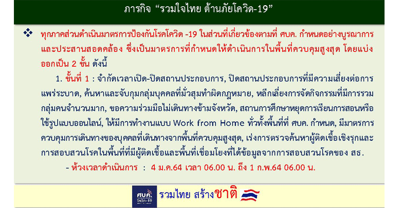 โดยมาตรการแบ่งเป็น 2 ขั้น ขั้นที่ 1 จำกัดเวลาเปิดและปิดสถานประกอบการ ปิดสถานประกอบการที่มีความเชื่อมโยงเสี่ยงต่อการแพร่ระบาด ค้นหา และจับกุมกลุ่มบุคคลมั่วสุมทำผิดกฎหมาย หลีกเลี่ยงการจัดกิจกรรมที่มีการรวมกลุ่มกันของคนจำนวนมาก ขอความร่วมมือไม่ให้เดินทางข้ามจังหวัด สถานศึกษาหยุดการเรียนการสอนหรือใช้รูปแบบออนไลน์ ให้มีการทำงานแบบ work from home ทั่วทั้งพื้นที่ที่ ศบค. กำหนดมีมาตรการควบคุมการเดินทางของบุคคล ที่เดินทางจากพื้นที่ควบคุมสูงสุด เร่งการตรวจสอบค้นหาผู้ติดเชื้อเชิงรุก และการตรวจสอบสอบสวนโรคในพื้นที่ที่มีผู้ติดเชื้อและพื้นที่เชื่อมโยงที่ได้ข้อมูลการตรวจสอบโรคของสาธารณสุขโดยมีห้วงดำเนินการตั้งแต่วันที่ 4 ม.ค.64 เวลา 06.00 น ถึง 1 ก.พ. 64 เวลา 06.00 น ซึ่งจะต้องมีการนำเสนอให้นายกรัฐมนตรีลงนามอีกครั้งในฐานะ ผอ.ศบค.