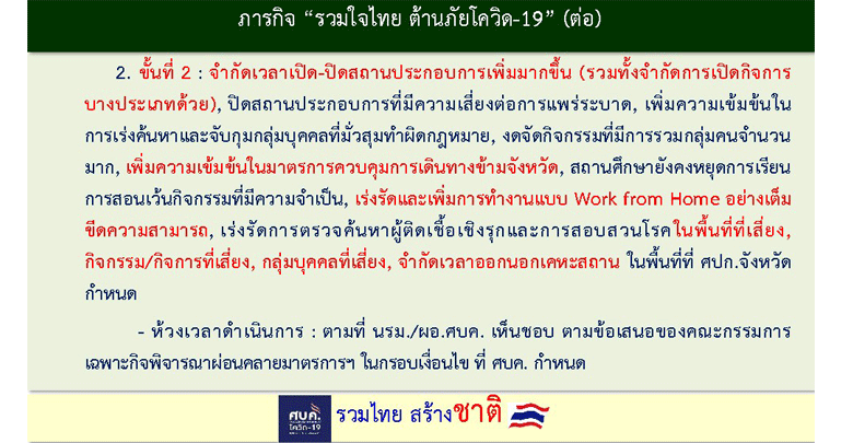 ขั้นที่ 2 คือ จำกัดเวลาเปิด-ปิดสถานประกอบการเพิ่มมากขึ้นรวมถึงจำกัดการเปิดกิจการบางประเภทด้วยปิดสถานประกอบการที่มีความเสี่ยงต่อการแพร่ระบาด เพิ่มความเข้มข้นในการเร่งค้นหาและจับกุมกลุ่มผู้มั่วสุมทำผิดกฎหมายกิจกรรมที่มีกลุ่มคนรวมตัวกันจำนวนมากเพิ่มความเข้มข้นในมาตรการควบคุมการเดินทางข้ามจังหวัด สถานศึกษายังคงหยุดการเรียนการสอนเล่นกิจกรรมที่มีความจำเป็นเร่งรัดและเพิ่มการทำงานแบบ work from home เร่งรัดตรวจสอบค้นหาผู้ติดเชิงรุกและการตรวจสอบสวนโรคในพื้นที่เสี่ยง กิจกรรมเสี่ยง กลุ่มบุคคลเสี่ยง จำกัดเวลาเข้าออกเคหสถานในพื้นที่ ศปก.จังหวัดกำหนด ห้วงเวลาดำเนินการตามที่นายกรัฐมนตรีในฐานะ ผอ. ศบค. เห็นชอบตามข้อเสนอของคณะกรรมการเฉพาะกิจพิจารณาผ่อนคลายมาตรการในเงื่อนไขกรอบที่ศบค.กำหนด นายแพทย์ทวีศิลป์ ยังเผยถึงกรณีจะมีการประกาศล็อกดาวน์ หรือประกาศเคอร์ฟิวหรือไม่นั้น ว่า หากย้อนดูตัวเลข ยังมีคนฝ่าฝืนเคอร์ฟิวถูกจับกรณีเล่นการพนัน และการออกนอกเคหสถาน ซึ่งแม้จะมีการใช้ยาแรงมากขึ้น ก็ไม่สามารถจัดการกับคนที่มีเจตนา ในการกระทำที่ไม่ถูกต้อง แต่คนที่เดือดร้อนกลายเป็นคนดีที่ทำอาชีพปกติ มีความเดือดร้อน ตรงนี้ขึ้นอยู่กับการขอความร่วมมือสูงสุด การใช้กฎหมายหรือการบังคับใช้ต่างๆ ไม่ได้ร้อยเปอร์เซ็นต์อย่างแน่นอน การใช้ยาแรงไม่ใช่ผลบวกต่อภาพรวมเศรษฐกิจ กลับทำให้มีผลกระทบมากขึ้น เพราะฉะนั้นตอนนี้เจ็บตรงไหนใช้ยาแรงตรงนั้น ภาพจะอธิบายให้ประชาชนทุกคนเข้าใจ คงไม่ต้องใช้มาตรการทางสังคมที่แรงเกินไป