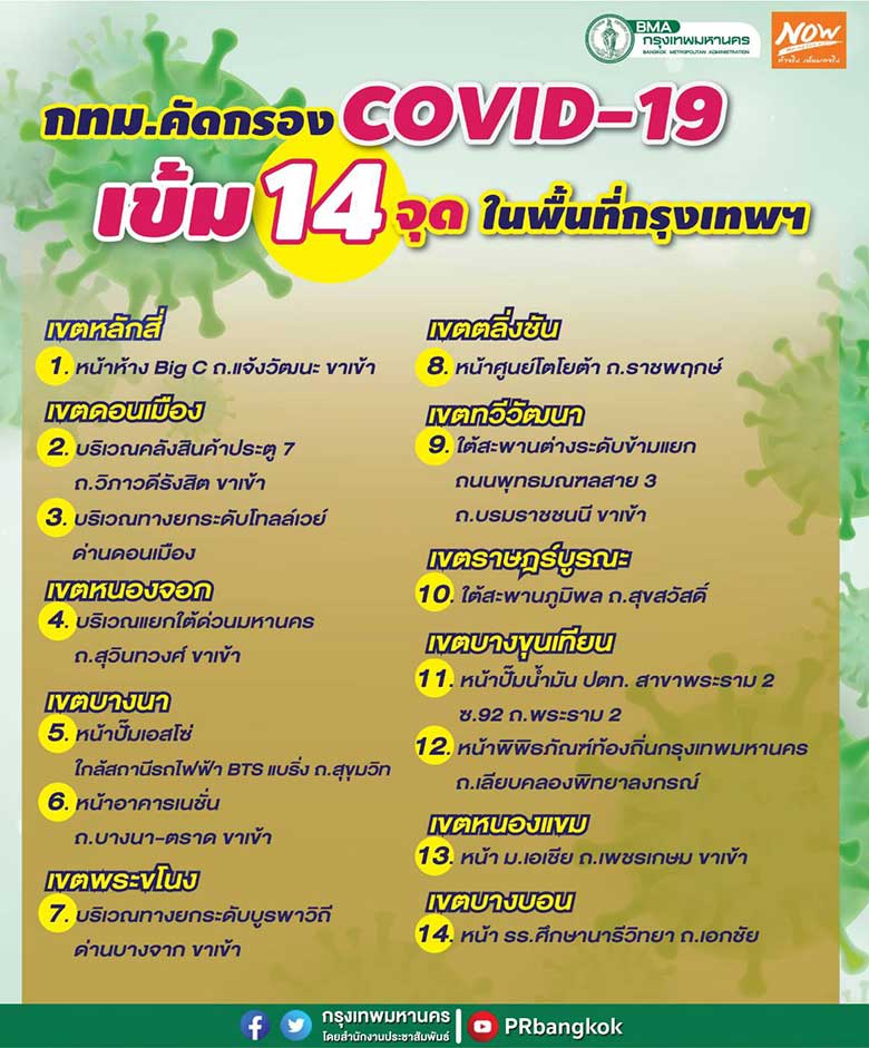 พล.ต.ต.จิรพัฒน์ ภูมิจิตร รองผู้บัญชาการตำรวจนครบาล เปิดเผย หลังจากกรุงเทพมาหานครมีคำสั่งให้สำนักงานเขตที่เกี่ยวข้อง ตั้งด่านคัดกรองป้องกันการแพร่ระบาดของโรค โควิด-19 ก่อนเข้าพื้นที่กรุงเทพมหานคร 14 จุด ว่า ผู้บัญชาการตำรวจนครบาลได้สั่งการตำรวจพื้นที่ที่รับผิดชอบทั้ง 14 จุด ให้จัดเตรียมกำลังไว้อำนวยความสะดวกด้านการจราจร และการตรวจสอบแรงงานต่างด้าว คอยสนับสนุนเจ้าหน้าที่สำนักงานเขต และเจ้าหน้าที่สาธารณสุข โดยเริ่มตั้งด่านตั้งแต่วันที่ 2 มกราคม 2564 ทั้งนี้ สำหรับด่านคัดกรอง ที่กรุงเทพมหานคร กำหนดไว้ 14 จุด ได้แก่ 1.หน้าห้างบิ๊กซี ถนนแจ้งวัฒนะขาเข้า 2.หน้าคลังสินค้าประตู 7 ถนนวิภาวดีรังสิตขาเข้า 3.ทางยกระดับโทลเวย์ ด่านดอนเมือง 4.แยกใต้ด่วนมหานคร ถนนสุวินทวงศ์ขาเข้า 5.หน้าปั๊มเอสโซ่ ใกล้สถานีรถไฟบีทีเอสแบริ่ง ถนนสุขุมวิท 6.หน้าอาคารเนชั่น ถนนบางนา-ตราด ขาเข้า 7.ทางยกระดับบูรพาวิถี ด่านบางจากขาเข้า 8.หน้าศูนย์โตโยต้า ถนนราชพฤกษ์ 9.ใต้สะพานต่างระดับข้ามแยกถนนพุทธมณฑลสาย 3 ถนนบรมราชชนนีขาเข้า 10.ใต้สะพานภูมิพล ถนนสุขสวัสดิ์ 11.หน้าปั๊มน้ำมัน ปตท.สาขาพระรามสองซอย 92 ถนนพระรามสอง 12.หน้าพิพิธภัณฑ์ท้องถิ่นกรุงเทพมหานคร ถนนเลียบคลองพิทยาลงกรณ์ 13.หน้ามหาวิทยาลัยเอเชีย ถนนเพชรเกษมขาเข้า 14.หน้าโรงเรียนศึกษานารีวิทยา ถนนเอกชัย